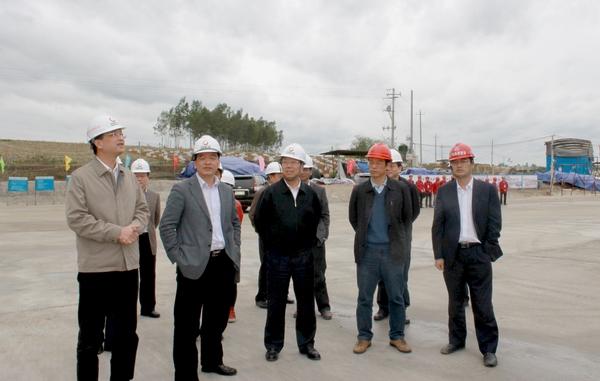 圖為:交通運(yùn)輸廳副廳長(zhǎng)梁毅(右二)、崇左市委書(shū)記趙樂(lè)秦(右三)、崇左市副市長(zhǎng)張鴻(左一)在項(xiàng)目現(xiàn)場(chǎng)檢查調(diào)研