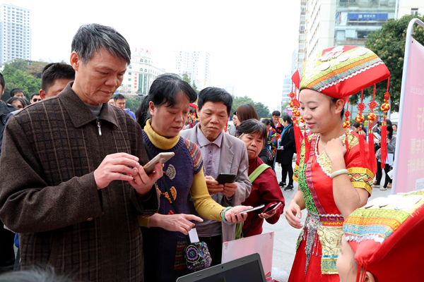 身著統(tǒng)一服裝,肩披綬帶、胸扣團(tuán)徽的ETC推廣青年突擊隊(duì)員向過(guò)往的行人宣傳ETC的相關(guān)知識(shí),耐心解答車主朋友們的疑問(wèn),并現(xiàn)場(chǎng)演示ETC八桂行卡的安裝過(guò)程,使廣大社區(qū)市民對(duì)ETC有了一個(gè)初步的認(rèn)識(shí)。6名身著靚麗壯族服飾瞬間吸引住了往來(lái)市民的眼光,紛紛前來(lái)咨詢業(yè)務(wù)?;顒?dòng)期間,一卡通公司客服人員熱情地向社區(qū)居民發(fā)放了100張“桂民卡·體驗(yàn)卡”,亦有不少市民被桂民卡精美的版面設(shè)計(jì)和強(qiáng)大的互聯(lián)互通功能所吸引,紛紛在現(xiàn)場(chǎng)辦理購(gòu)卡及充值業(yè)務(wù)。票通公司客服人員則向社區(qū)居民推介了廣西人自己的道路客運(yùn)網(wǎng)絡(luò)售票平臺(tái)——“桂客行”,耐心地向市民解析平臺(tái)功能、覆蓋范圍等,并協(xié)助市民下載“桂客行”手機(jī)APP。