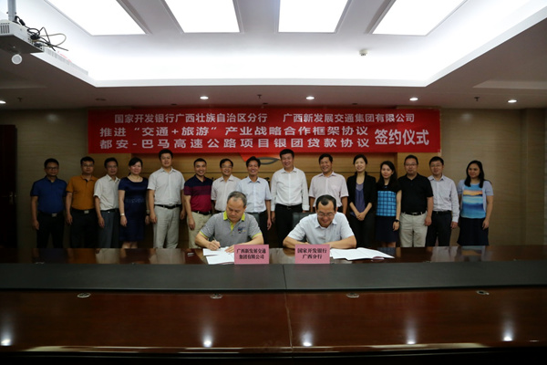 6月9日,集團(tuán)公司與國家開發(fā)銀行廣西分行在南寧簽訂戰(zhàn)略合作框架協(xié)議。集團(tuán)公司黨委書記、董事長朱堅(jiān)和,黨委副書記、副董事長、總經(jīng)理唐咸秋,黨委委員、總會計(jì)師鄧遠(yuǎn)志,國家開發(fā)銀行廣西分行黨委書記、行長謝志軍,副行長呂軍等領(lǐng)導(dǎo)出席簽約儀式。簽約前,雙方進(jìn)行了友好會談,雙方重點(diǎn)圍繞賀州至巴馬高速公路、融水至河池高速公路、國省干線公路及沿線地區(qū)的“交通+旅游”項(xiàng)目開展深度戰(zhàn)略合作等方面進(jìn)行了深入的交流與探討,并達(dá)成了一致共識。座談會后,唐咸秋與呂軍分別代表雙方簽訂戰(zhàn)略合作框架協(xié)議。雙方有關(guān)部門負(fù)責(zé)人參加簽約儀式。(集團(tuán)公司 投資改革發(fā)展部)