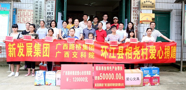 8月18日,廣西新發(fā)展交通集團(tuán)到環(huán)江縣明倫鎮(zhèn)相堯村開展愛心助學(xué)金和產(chǎn)業(yè)發(fā)展基金捐贈(zèng)活動(dòng),向相堯村貧困學(xué)子捐贈(zèng)文體用品、學(xué)習(xí)用具、愛心款,資助相堯村稻田養(yǎng)魚特色產(chǎn)業(yè)。