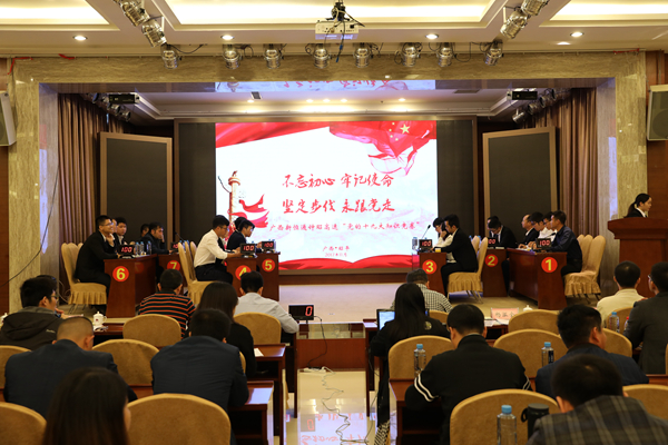 11月15日,新恒通公司賀巴高速(鐘山至昭平段)建設(shè)指揮部黨支部精心組織,舉辦了一次高質(zhì)量的黨的十九大知識競賽?;顒右?ldquo;不忘初心、牢記使命,堅定步伐、勇跟黨走”為主題,各參建單位7個代表隊參加了比賽,指揮部代表隊以480分摘得桂冠。
