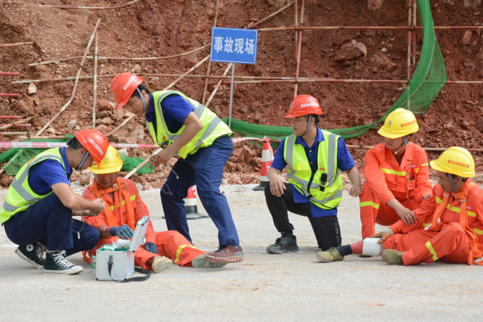 當(dāng)天的演練現(xiàn)場(chǎng)模擬情景為:2019年6月20日,在羅城縣四把鎮(zhèn)沖灣屯附近,融河高速公路K54+100高邊坡處現(xiàn)場(chǎng)4名邊坡防護(hù)作業(yè)人員正在緊張的施工,由于連續(xù)雨天上邊坡坡頂土體部分突然滑落,繼而出現(xiàn)大的滑坡裂縫,隨之大面積土石體坍塌,1名施工人員被垮塌的土石壓埋。事故發(fā)生后,參與演練人員及時(shí)報(bào)告和啟動(dòng)應(yīng)急預(yù)案,在坍塌現(xiàn)場(chǎng)設(shè)置臨時(shí)指揮部,指揮現(xiàn)場(chǎng)救援,將傷者抬出被困位置后,在演練會(huì)場(chǎng)進(jìn)行現(xiàn)場(chǎng)醫(yī)療和急救演示,再由救護(hù)車送到羅城縣人民醫(yī)院進(jìn)一步治療。